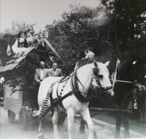 Person mit schwarzen Haaren auf dem Kutschbock ist Dieter Pauly auf dem Festwagen des Baugeschäft Mai zum Schul-und Heimatfest 1963