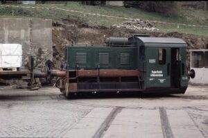 Werkbahn Papierfabrik; diese Lok heißt Kö (Kleinlok mit Öl-(Diesel-)Motor und Flüssigkeitsgetriebe); Quelle: Frank Drechsel